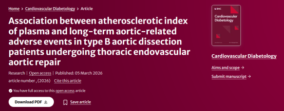 近日,由我院外聘博士研究生导师周建教授领衔的海军军医大学第三附属医院血管外科团队,在权威期刊 Cardiovasc Diabetol(中科院&JCR双1区TOP)发表主动脉夹层预后研究成果。我院生物医学工程专业硕士研究生张佳禾作为共同第一作者深度参与。